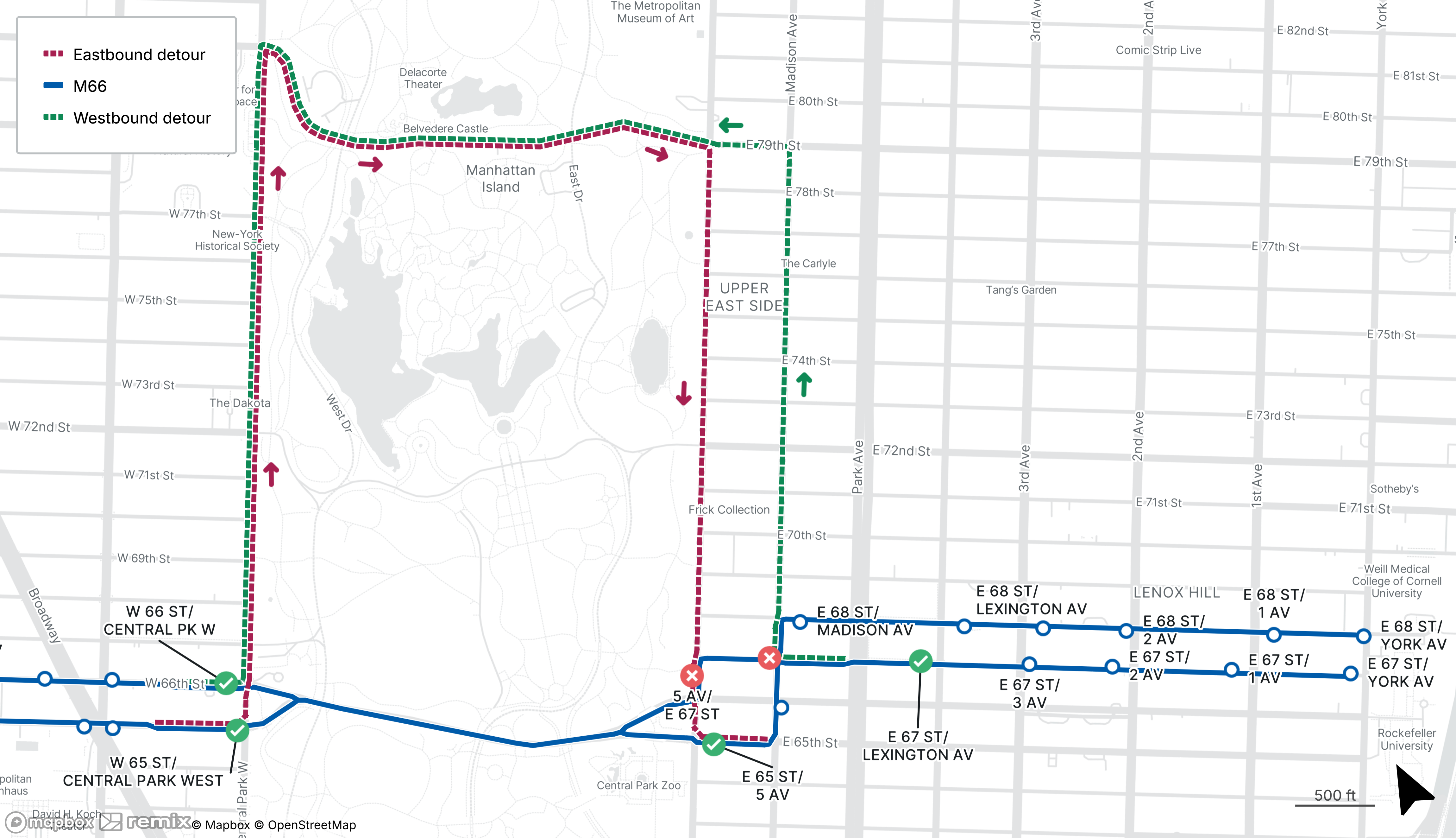 - Westbound M66 stops on E 67th St at Madison Ave, and 5th Ave at E 67th St will be closed - no stops will be missed eastbound